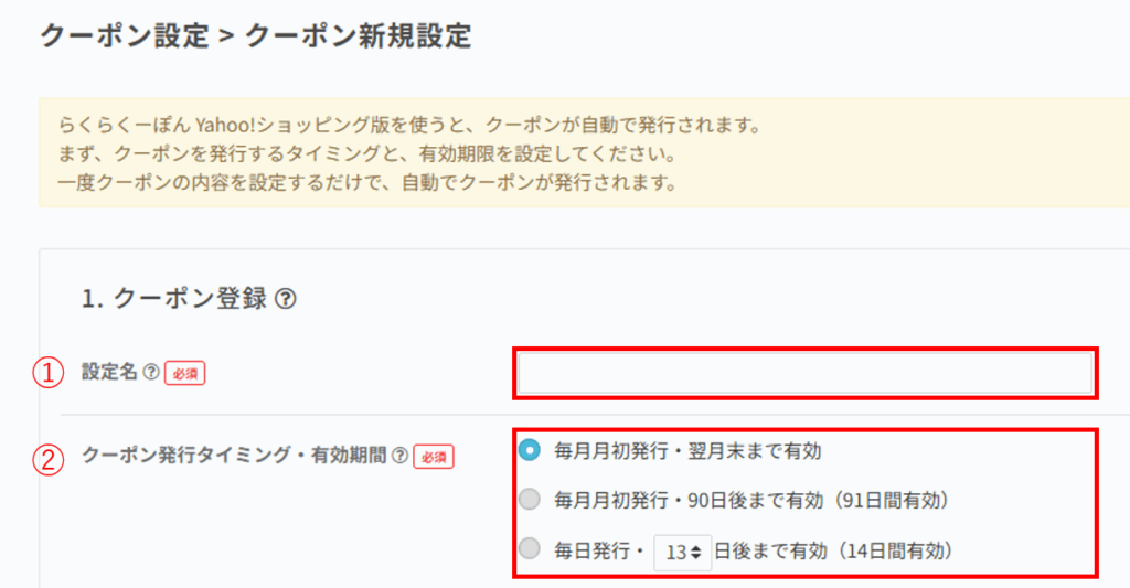 ①らくらくーぽん Yahoo!ショッピング版で管理するクーポン設定名を入力してください。