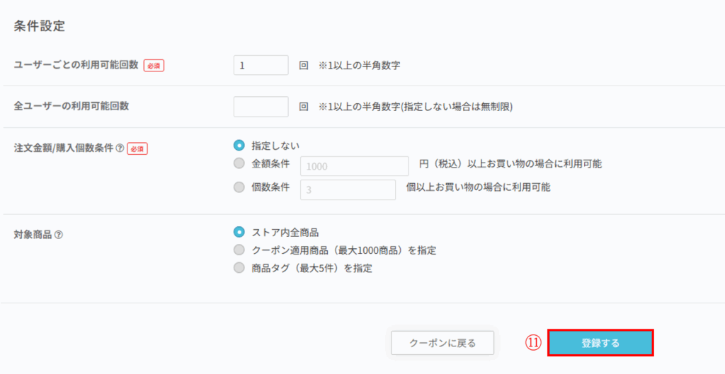 条件設定はクーポン適用条件になります。適宜ご設定ください。