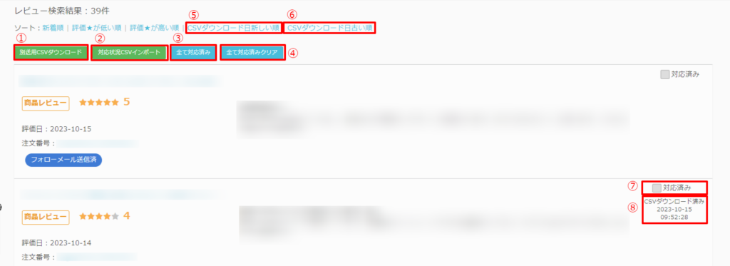 すべてのレビューの「対応済み」のチェック欄(⑦)からチェックを外します。 - CSVダウンロード日新しい順