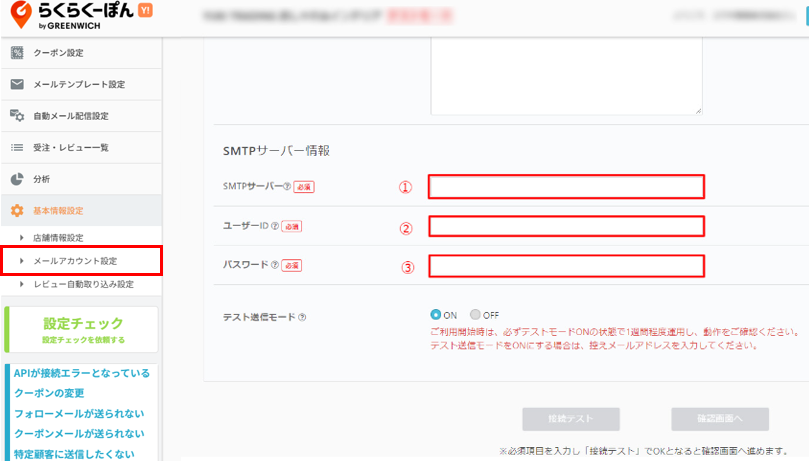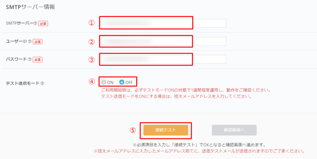 ⑤接続テスト:SMTPサーバー情報入力後、接続テストをクリックし、OKが出るか確認してください。