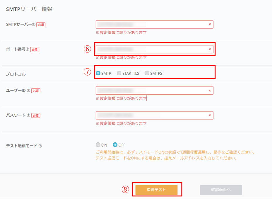 ⑧接続テスト:SMTPサーバー情報入力後、接続テストをクリックし、OKが出るか確認してください。