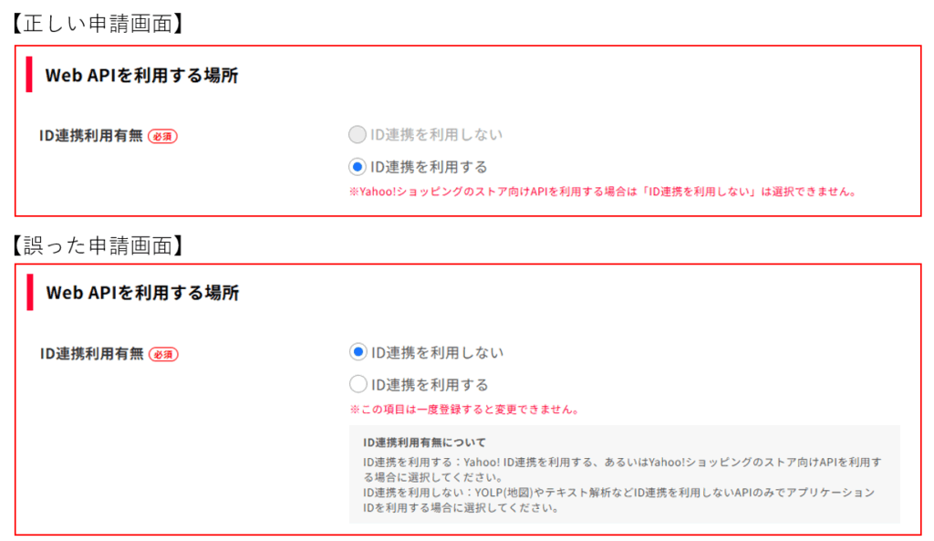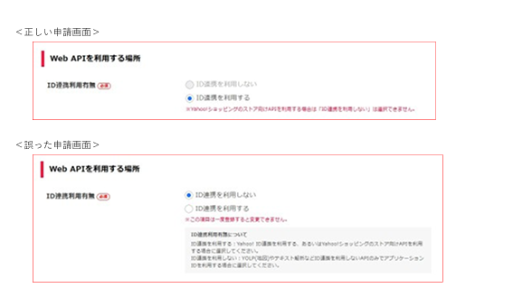 下記画像のような「ID連携を利用しない」が選択できる画面からアプリケーションIDを作成すると、らくらくーぽん Yahoo!ショッピング版では利用できない種別のアプリケーションIDが作成されてしまい、このエラーが発生します。