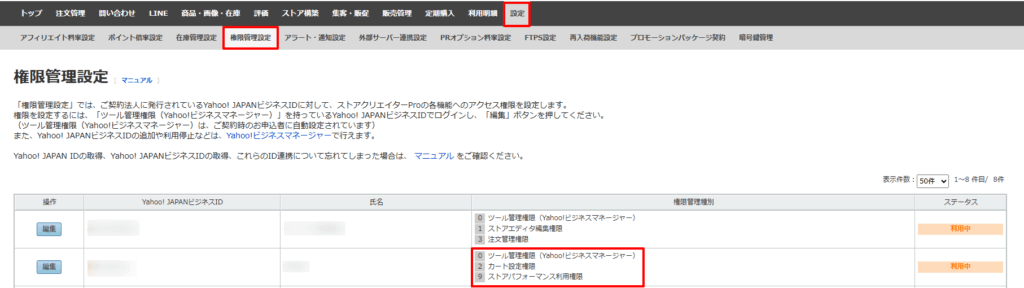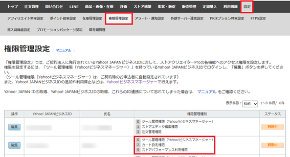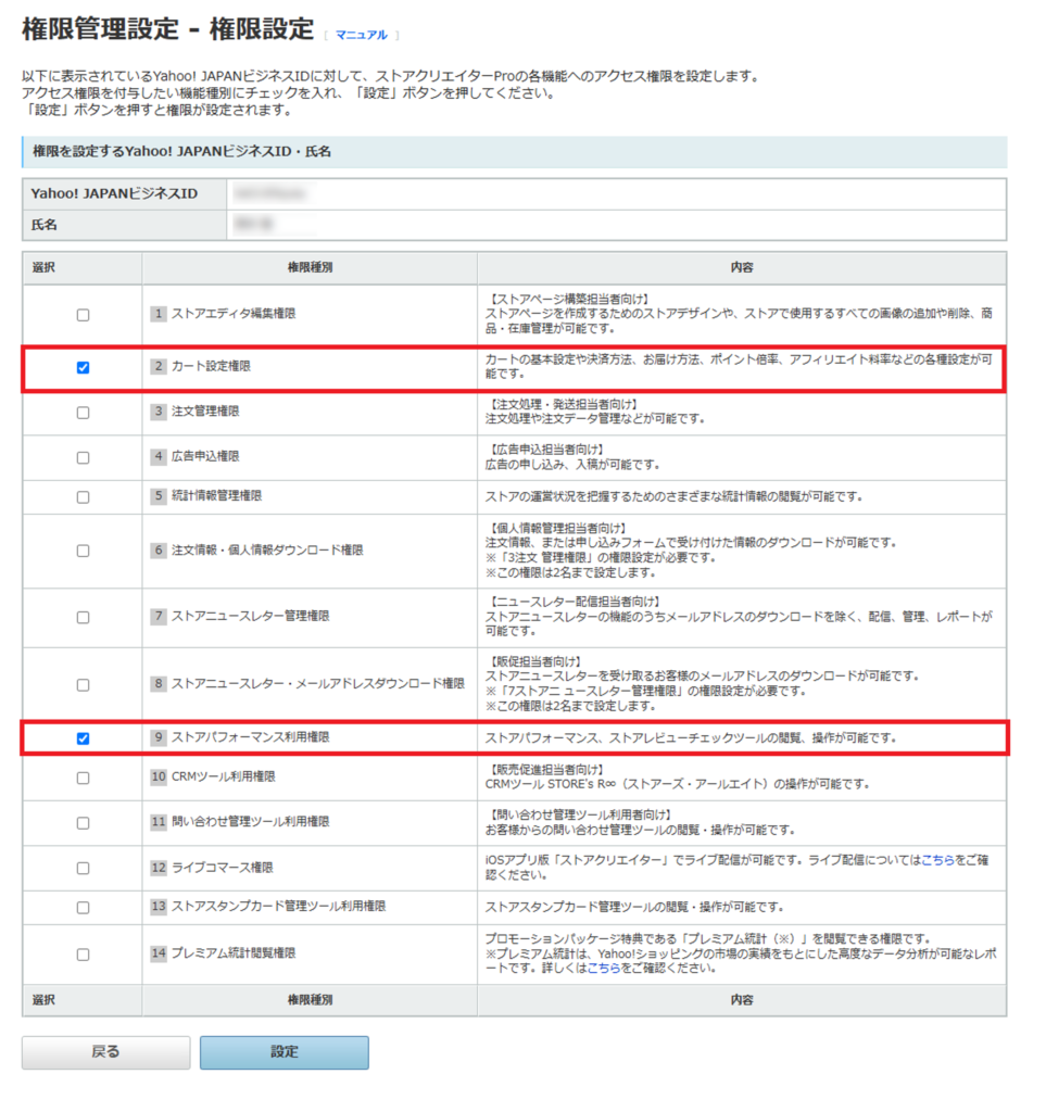 「【2】カート設定権限」と「【9】ストアパフォーマンス利用権限」は、