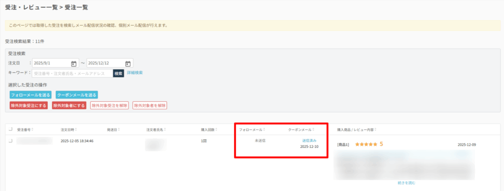フォローメール送信前にレビュー投稿があった場合 2026.02.25 よくあるご質問 フォローメールが送られる前にレビュー投稿がされた場合は、クーポンメールは送信され、フォローメールは送信されません。 また、こちらは設定の変更などは行えませんので、ご了承ください。