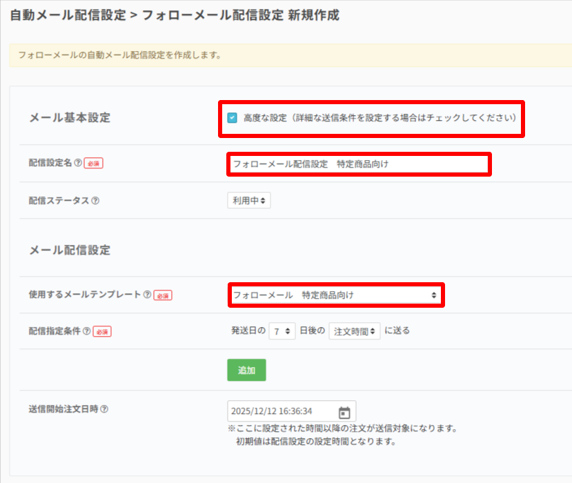 特定商品用に配信設定名(管理用)を入力し、先ほど作成した特定商品用フォローメールのテンプレートを選択します。その後、「高度な設定」にチェックを入れます。