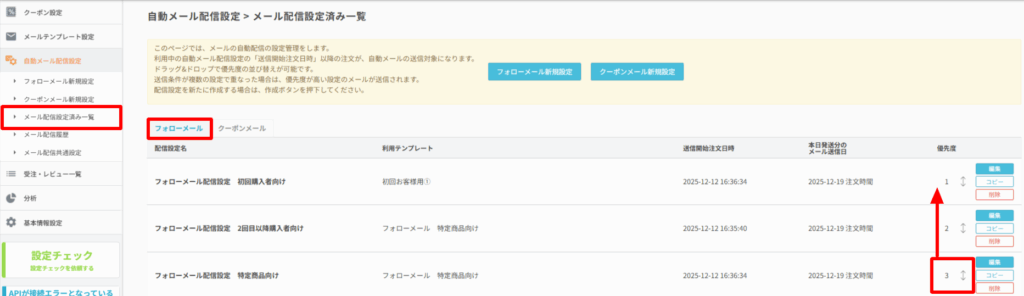 先ほど作成したフォローメール配信設定の優先度をスライドして上げます。