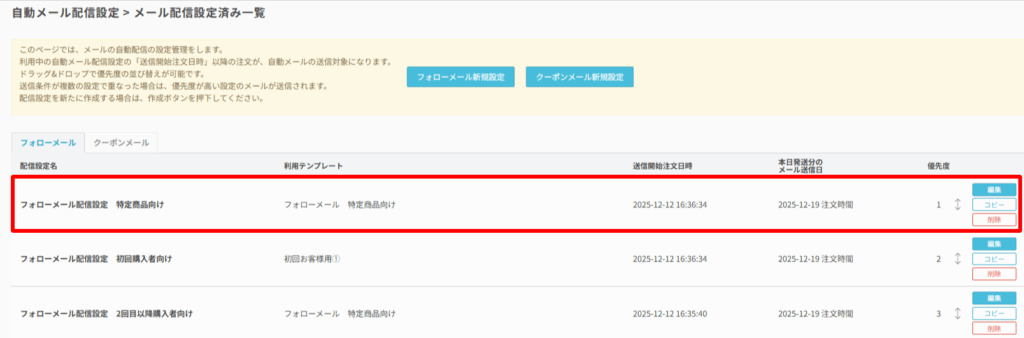 再度、自動メール配信設定>メール配信設定済み一覧 を開きます。