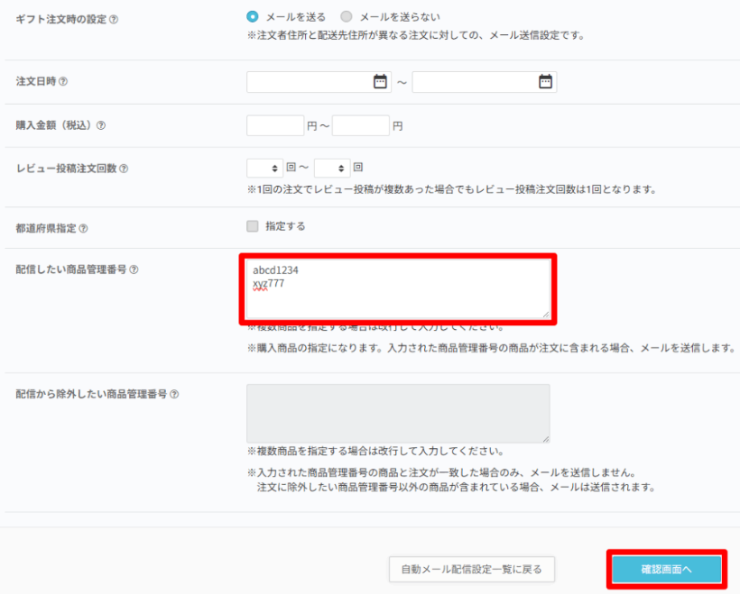 配信したい商品管理番号の項目に、メール送信の対象となる商品管理番号を入力します。