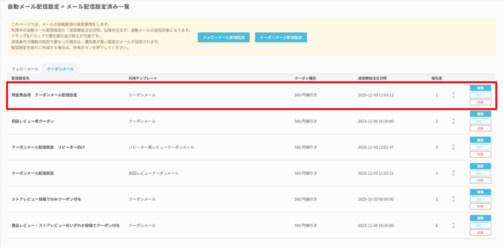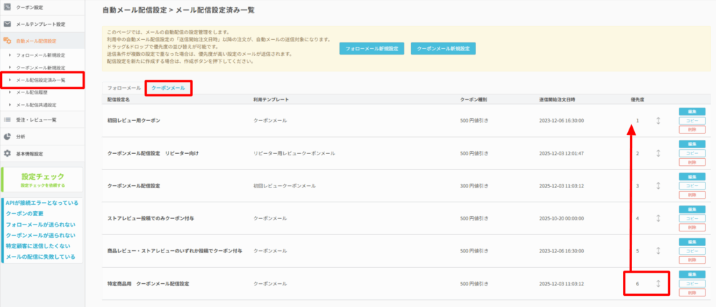 先ほど作成したクーポンメール配信設定の優先度をスライドして上げます。
