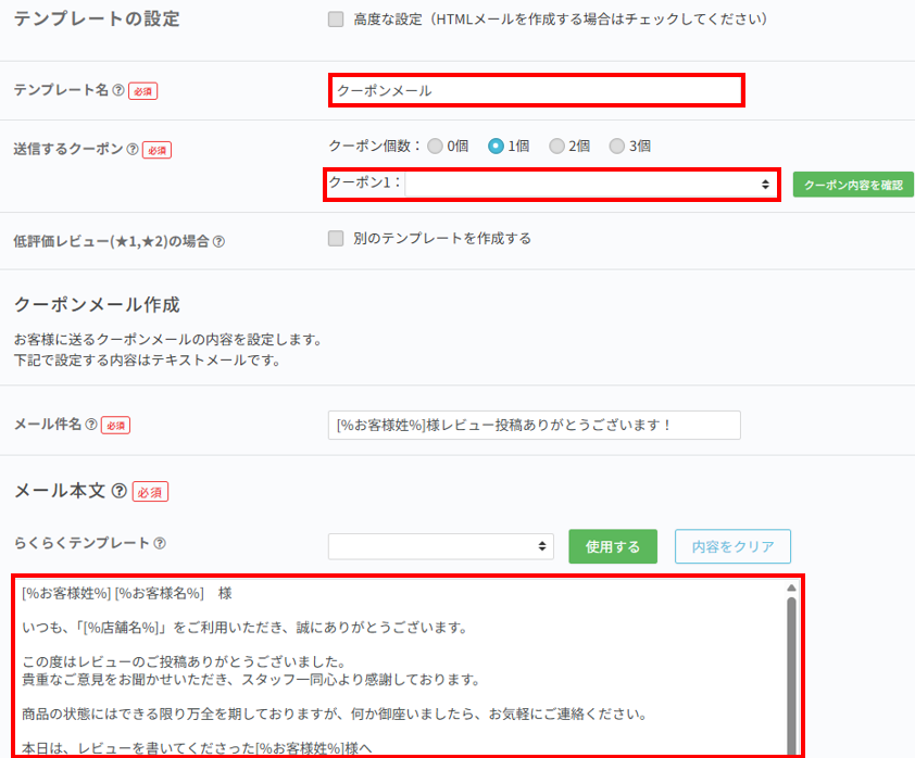 特定商品用にテンプレート名(管理用)を入力し、先ほど作成した特定商品用のクーポン設定を選択してメール件名やメール本文を編集します。