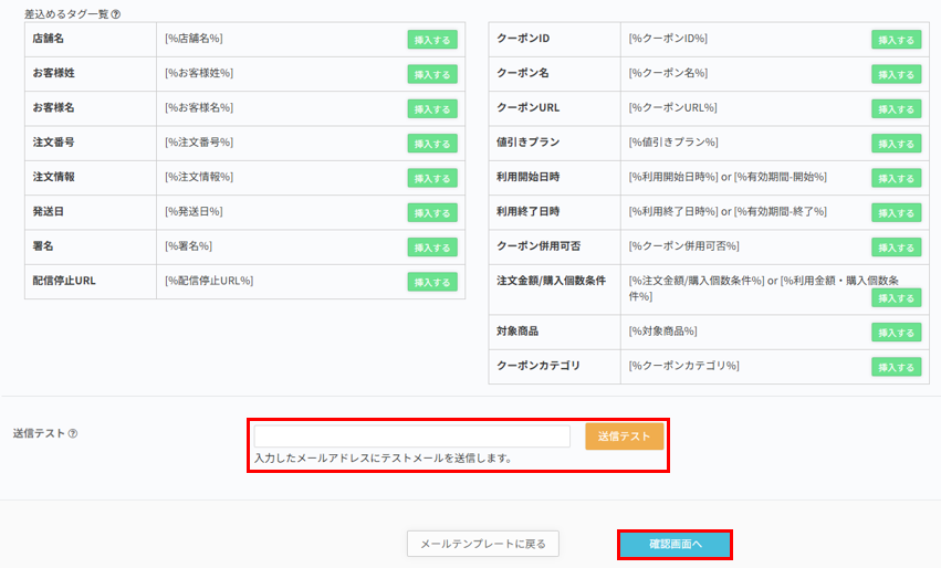 設定に問題なければ、確認画面へ > 登録 で特定商品用のクーポンメールテンプレートが作成完了です。