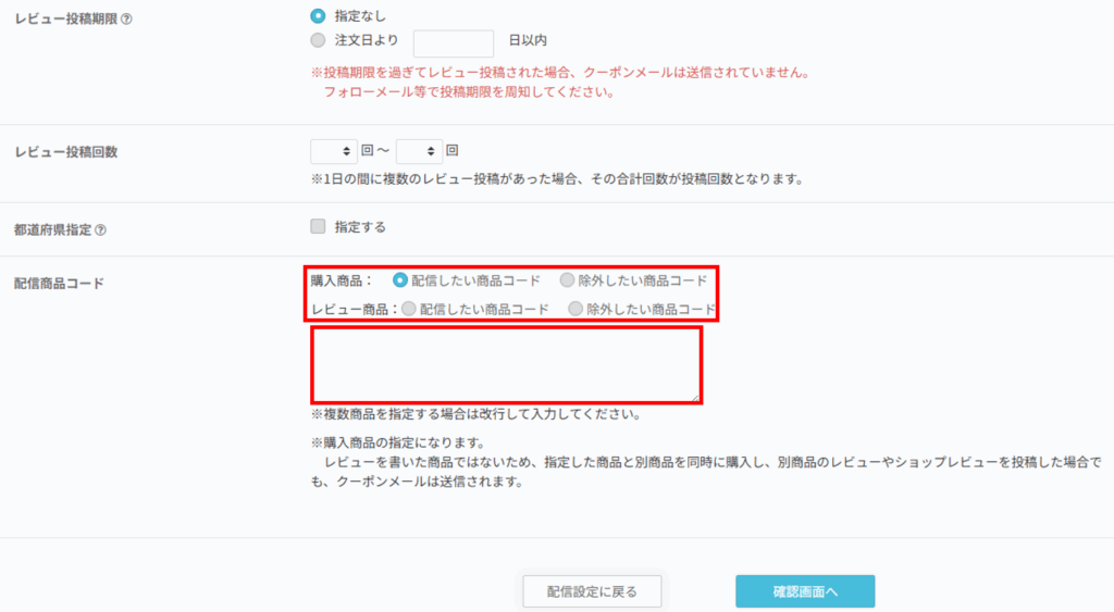 配信商品コードの項目で、購入商品指定またはレビュー投稿商品指定を選択します。