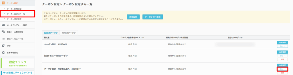 クーポン設定>クーポン設定済み一覧 を開きます。