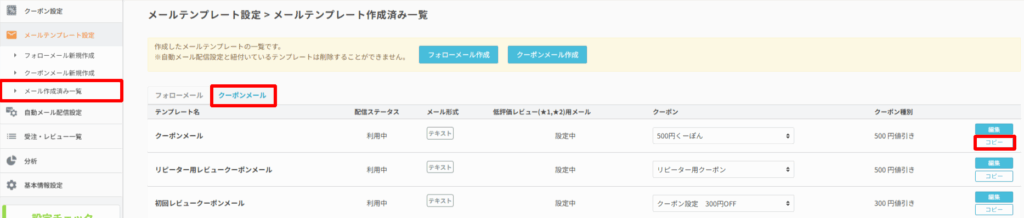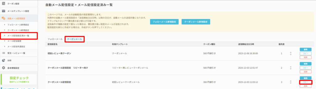 クーポンメールタブが選択されていることを確認し、該当する配信設定のコピーボタンをクリックし、