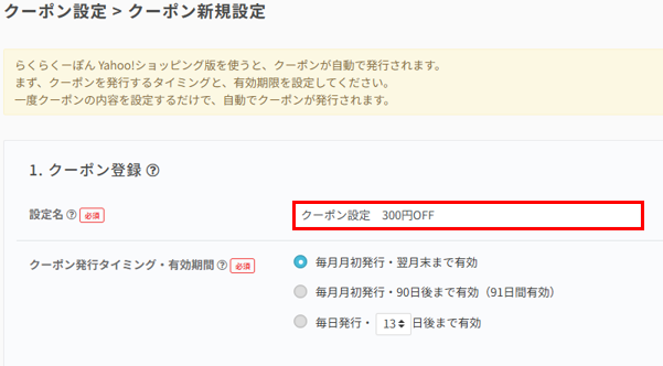 ※300円のクーポンを発行する設定の場合、「クーポン設定 300円OFF」など設定名で分かりやすくすることをおすすめします。