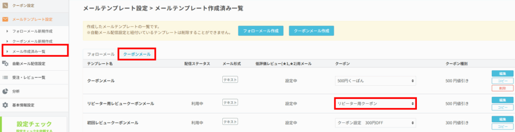 メールテンプレート設定>メール作成済み一覧を開き、クーポンメールのタブをクリックします。