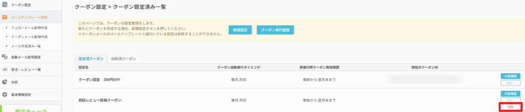 クーポン設定>クーポン設定済み一覧 より、切り替えた古いクーポン設定を利用しない場合、削除ボタンをクリックして削除します。