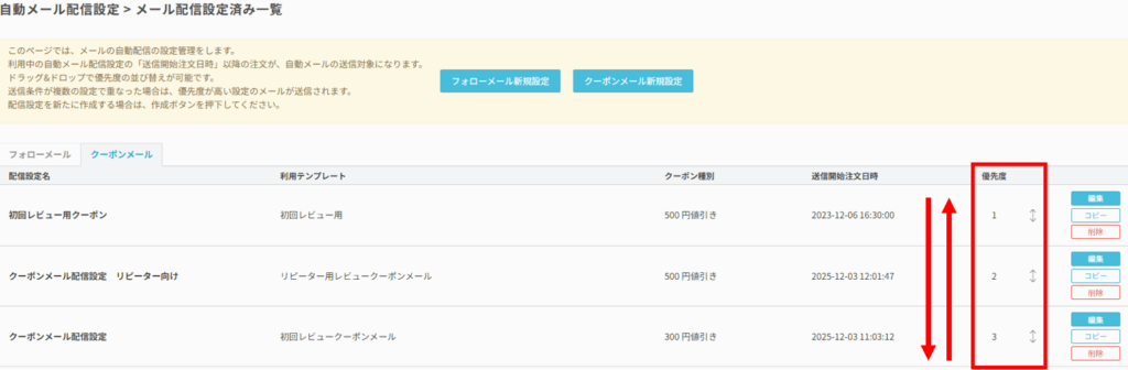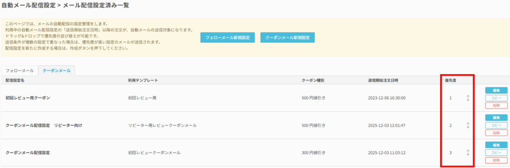 複数の配信設定が存在する場合、一覧に記載されている優先度を参照し、