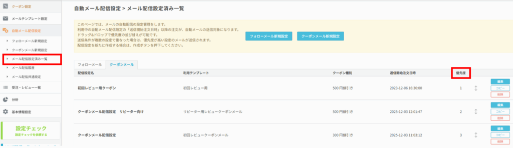 自動メール配信設定>メール配信設定済み一覧 を開きます。