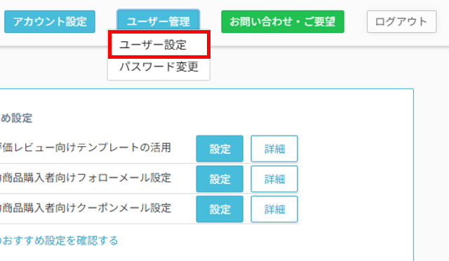 管理画面上部にある「ユーザー管理」をクリックし、下部に表示される「ユーザー設定」をクリックします。
