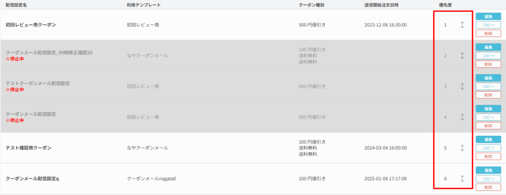 3で作成した配信設定の優先度の右隣の矢印をドラッグし通常送るメールより上に持っていき、ドロップすると優先度が変わります。