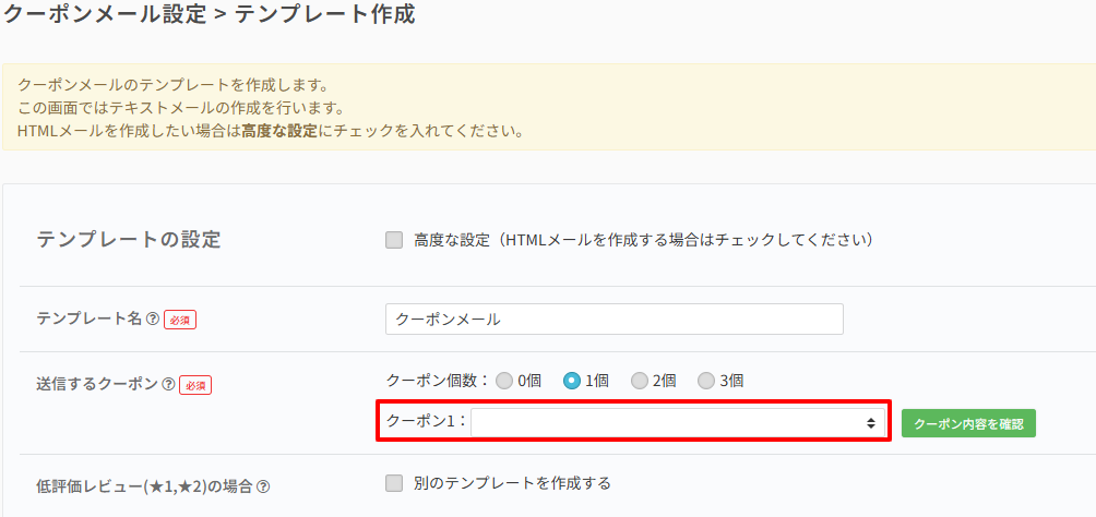 ※クーポンメールでは1で発行したクーポンを選択します。