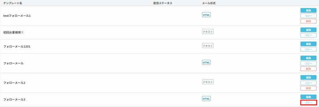 フォローメール設定(クーポンメール設定)>テンプレートの順にクリックし、メールテンプレート一覧からコピーしたいテンプレートのコピーボタンをクリックします。