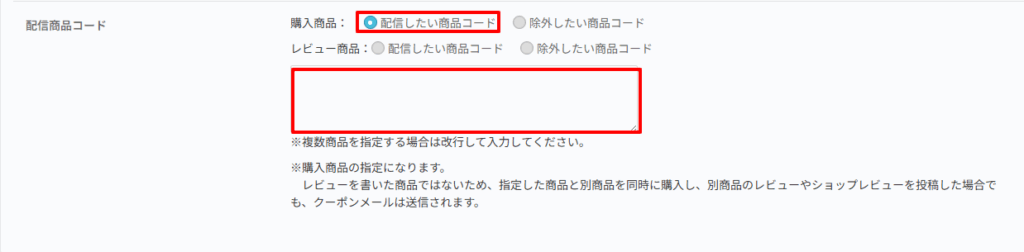 表示された高度な設定内の配信商品コードの項目から購入商品の配信したい商品コードに商品管理コードを入力します。